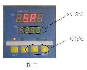 3.1 (見圖二)按一下“SET”鍵,此時PV 屏顯示“ ”,SV 屏顯示設定溫度值;