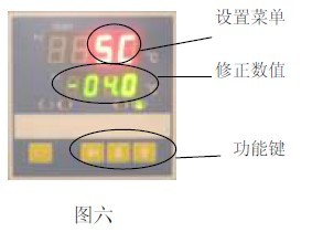 7.1.3 (見圖六)再按“SET”鍵若干次,找到所需要調整的控制參數的“SC”提示符,按功能鍵,使該控制參數顯示為所需要的值;SC = 原始SC值 +(實際溫度 - PV顯示值)